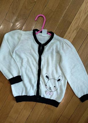 В ідеальному стані оригінальна кофточка на дівчинку 18-24міс. Довжина по спині 36см, довжина рукава з плечем 40см, ширина під пахвами 32см. Стан нового. Є невеличке забруднена пляма на третьому фото, після прання - зникне.