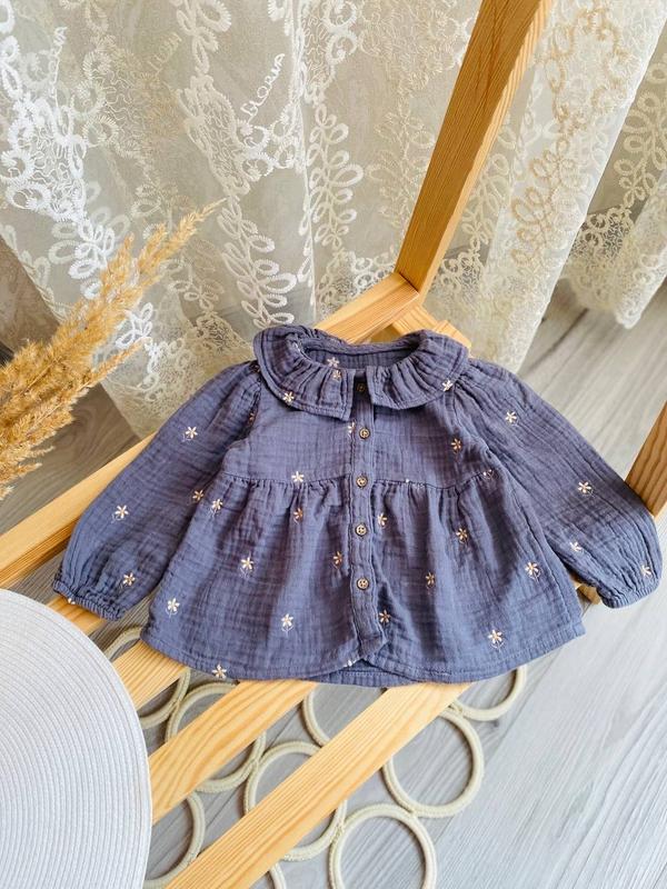 Муслінова блуза на 9-12 місяців. (Заміри: довж 32 см, шир 27 см, рукав 28 см). Стан ідеальний.