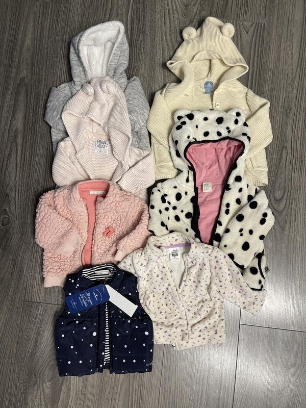 1 жилетка нова Tom Tailor (3 м) 250 2 кофта Zara (3-6, 68) 100 3 кофта плюш HM( 9-12. 80) 250 4 рожева Італія (3-6) 200 5 рожева Fred flo(0-2) 200 6 беж gap(6-12) 350 7 сіра тепла (1-6) 100
