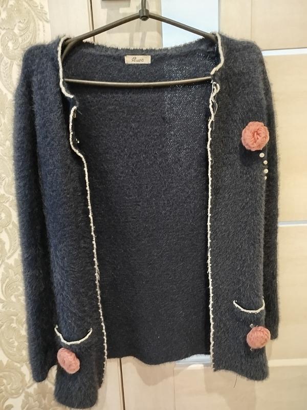 Женский кардиган темно-синего цвета из мягкой, пушистой вязаной ткани, приятной на ощупь На передней части расположены декоративные вязаные элементы в виде нежно-розовых цветов, а также небольшие декоративные пуговицы, создающие оригинальный и женственный акцент. Кардиган имеет длинные рукава и удобные декоративные карманы. Подходит для повседневной носки, хорошо сочетается с платьем, джинсами и классическими брюками. Идеальный вариант для прохладной погоды и создания уютного образа.