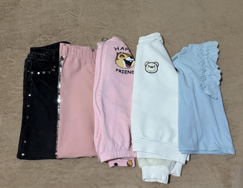 Джинси чорні LC Waikiki (8-9 років, 128/134 зріст), рожеві штанішки LC Waikiki (8-9 років, 128/134 зріст, на попі є невеликі 2 плями), рожева кофта з хомʼяком 6-7 років на зріст 122, тепла біла кофта на зріст 128, голуба футболка LC Waikiki (6-7років, 116/122зріст),