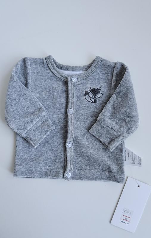 Велюрова кофтинка Name It , розмір вказано 50, більшомірить, буде на 0-3 міс. Довжина - 25 см, рукав від горловини - 22,5 см, ПОГ - 23 см.