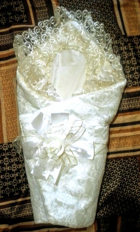 Гарна, вишукана модель конверту для малюків. Виріб неодмінно доповнить церемонію виписки немовля та огорне своїм теплом. Дана модель легко фіксується за допомогою липучки. Конверт декоровано гіпюром, доповнює красу квітка . Виріб представлено у білому і золотистому кольорах .Один раз використовували.В ідеальному стані