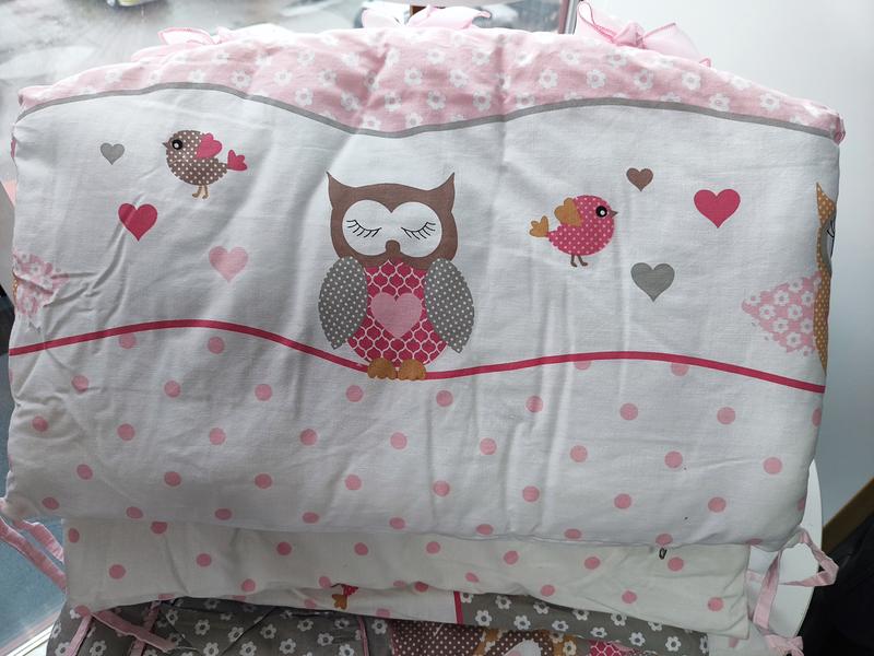 В комплекті є наматрацник, простирадло на резинці, пласка подушка, чохол на неї, бортики, ковдра