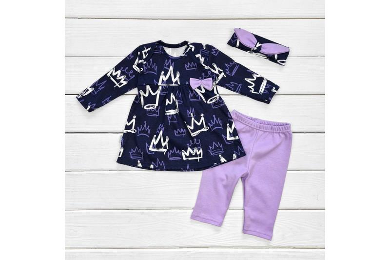 Ідеальний набір для прогулянок для дівчаток: - туніка з принтом по тканині - корони; - однотонні лосини; - повязочка з бантиком. Комплект пошитий з тканини інтерлок. Склад 100% бавовна.