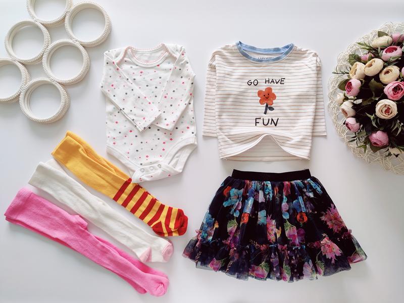 Реглан, боді та колготки нові, стік. Спідниця пишна в ідеальному стані! Верх: НОГ , см. 28 Верх: Довжина , см. 28 Верх: Рукав від плеча , см. від комірця 26 Довжина виробу , см. боді: 33, ширина 22, рукав 21, юбка: резинка 17-22, довжина 22