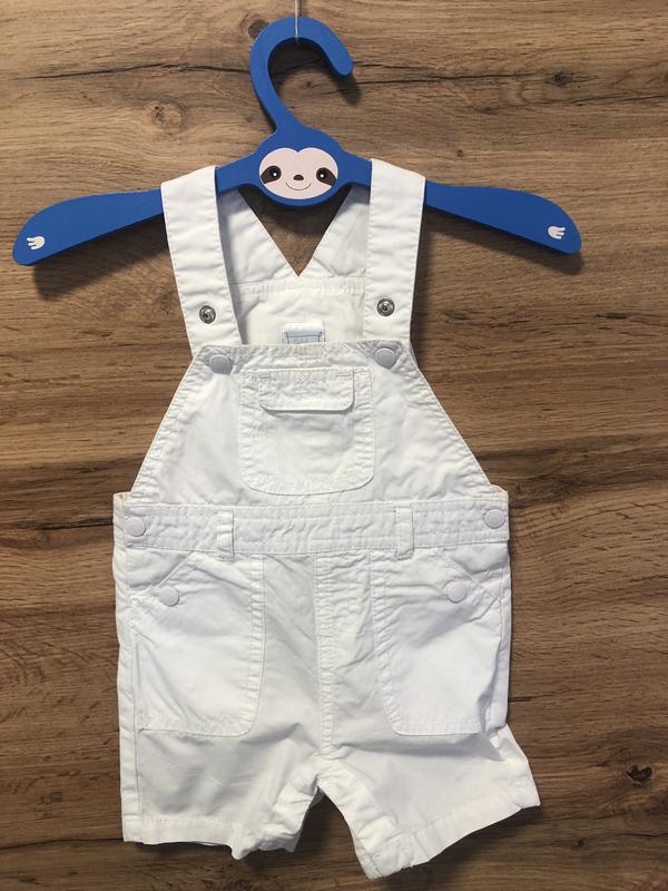 Cтильний котоновий білий комбінезон. З регулюючими бретелями. По боках з кнопками для більшого комфорту. Прикрашений кишеньками з кнопками та логотипом. Склад: 100% бавовна. Заміри: Висота шортиків до поясу – 19 см Висота посадки шортів – 19 см Талія – 24 см Загальна довжина при максимальній довжині бретельок– 43 см Стан - ідеальний.