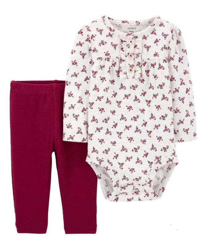 Новий набір Carter's для дівчинки з 2-х предметів включає боді з довгим рукавом та легкі штани в рубчик. На боді знизу застібка на кнопках, для більш легкого одягання спереду є застібка на гудзиках. На штанах - еластичний пояс. Склад - 95% бавовна, 5% - еластан. Розмір 1 - 3 міс на зріст 55 - 61 см.