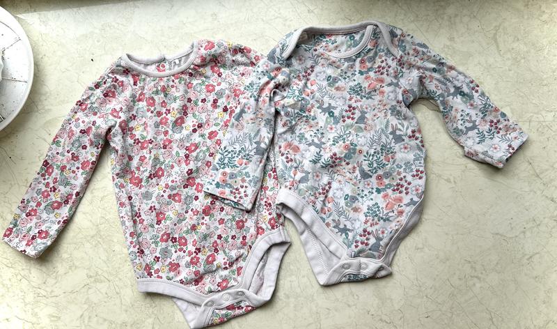 Стан ідеальний. Одягалися декілька разів. З червоними квіточками TU 6-9 місяців (68-74 см), але до року носити можна. Ззаді зачіпається на кнопки. 100 % котон. Із зайчиками M&S. 3-6 місяців (69 см), але можна одягати до року. Є рукавички на рукавах, щоб дитинка не мерзла. 100% котон.