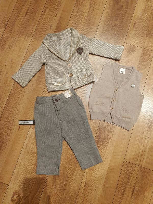 речі нові. не встигли поносити. брюки Next, 6-9 місяців довжина 37 см пояс 22 см ( добре тягнеться) 200 грн піджак , розмір 62 см плечі 21 см рукав 24 см ширина 25 см довжина 28 см. 150 грн жилет Bombili, розмір 68 см / 6 місяців. плечі 20 см ширина 26 см довжина 30 см 50 грн дивіться всі оголошення ще є дитячі речі
