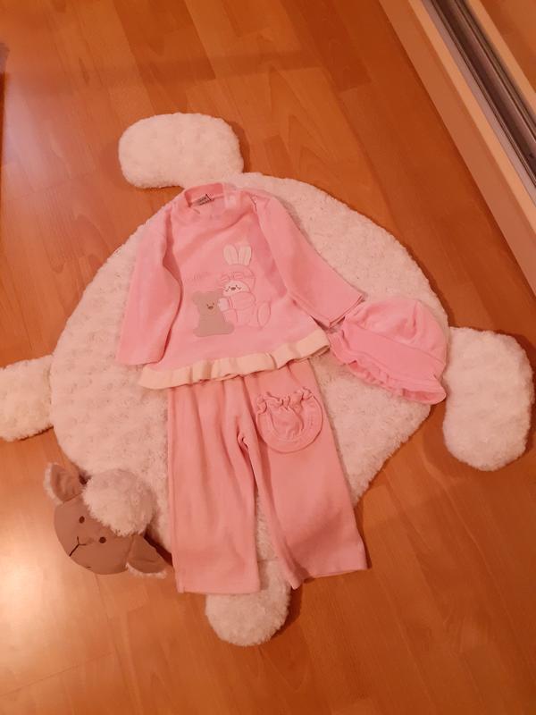 Дуже гарний, ніжно- рожевий колір, на кофточці закльопки, то зручно одягати, на штанішках хороша резиночка не здавлює. Стан дуже хороший, недоліків не знайшла.