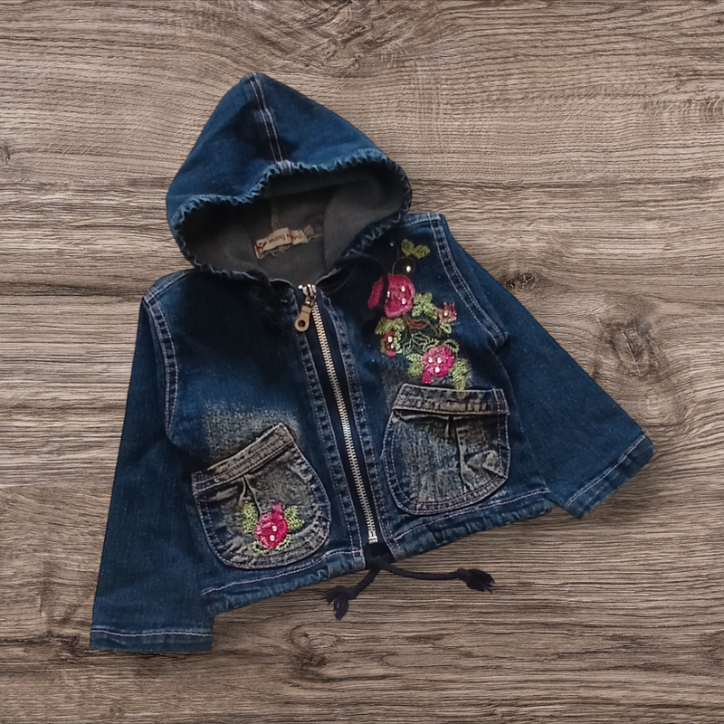 Нова якісна курточка джинсова на замку з капюшоном на двома карманами. Декорована вишивкою зі стразами. Заміри: довжина спинки 28,5см ширина 27см рукав 28см