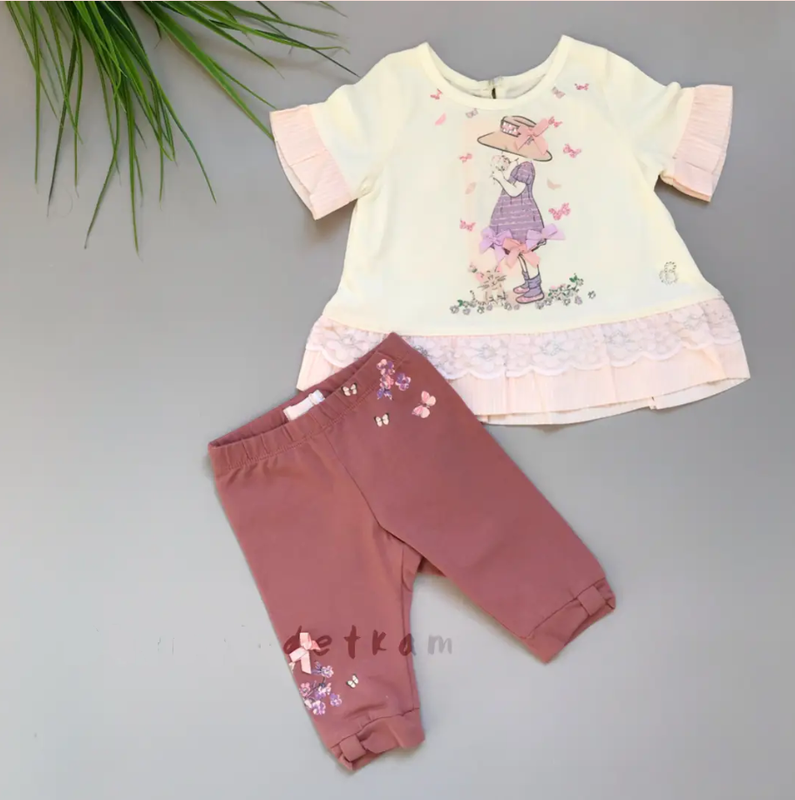 Футболка для дівчинки з коротким рукавом і лосини ТМ Бембі з дизайнерської колекції зі стразами, бантиками та друком. Матеріал - супрем, 100% бавовна. Розміри 62 і 68. Колір пудровий.