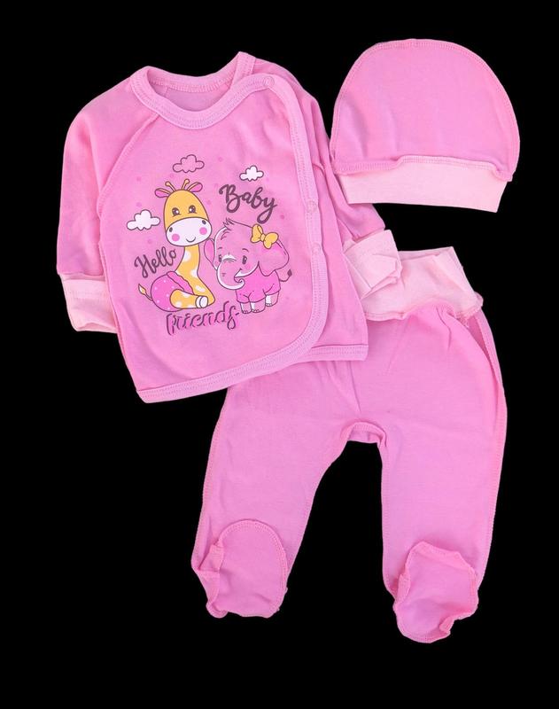 Комплект 3в1 складається із сорочечки (льолі), повзунків та шапочки. Чудово підійте в пологовий будинок із перших хвилин народження.Виготовлений із натуральної тканини - інтерлок (100% бавовна).Шви назовні. Малюку в такому комлекті буде комфортно як в маминих обіймах.