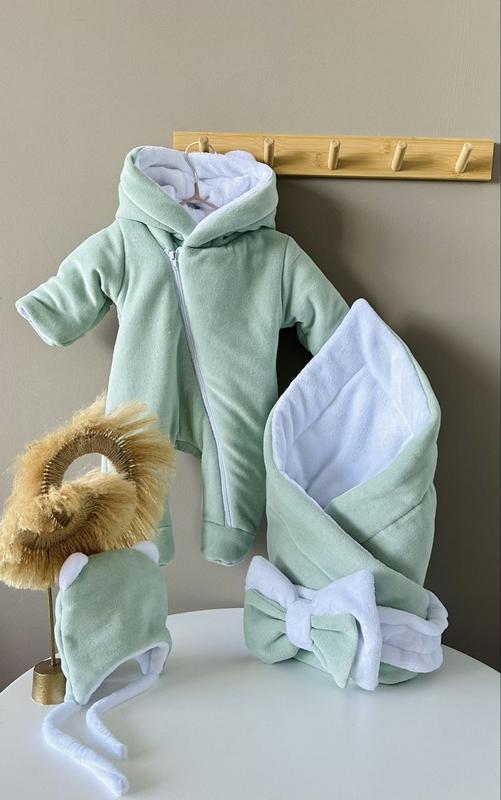 Теплый Велюровый набор на махре Размер - 0-3 месяца Тканина : Верх – велюр Наполнитель - Синтепух Подклад - махра Конверт: Размер 80*80 Тканина велюр Наполнитель – синтепух Вторая сторона конверта – махра Бантик на резинке Набор можно использовать как на выписку так и для прогулки Также можно приобрести отдельно Цена Конверт 770грн Комбинезон 880грн Комплект 1600 грн