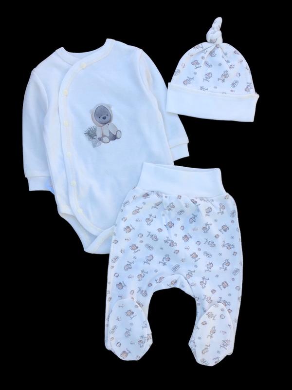 Комплект 3в1 складається із боді, повзунків та шапочки.Чудово підійте в пологовий будинок із перших хвилин народження.Виготовлений із натуральної тканини - інтерлок.Малюку в такому комлекті буде комфортно як в маминих обіймах.