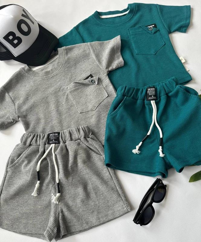 Крутий літній костюм для хлопчика Тканина - легенький вафельний трикотаж Пояс на резинці Є кишені Виміри 80-Довжина футболки 34 см ширина 28*2 см Довжина шортів 22 см пояс 18*2 см 90-Довжина футболки 36 см ширина 28*2 см Довжина шортів 24 см пояс 19*2 см 100-Довжина футболки 38 см ширина 30*2 см Довжина шортів 25 см пояс 19*2 см