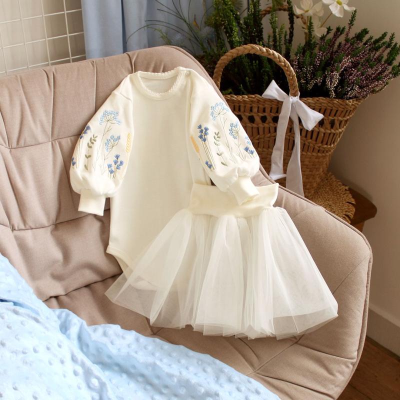 Одет один раз для фото Размер 20 на рост 62 см Вышитый набор боди и юбочка для новорожденных девочек Розмай от ТМ Ladan Модель боди с пышными рукавами и вышитыми цветами на них. Горловина обработана кружевным швом, на плече застежка. Пошит из хлопкового материала интерлок, 100% хлопок. Машинная вышивка Юбочка из евро сетки. Фатин составлен вдвойне, собран в глубокие складки и пришит к евро резинке (ПЕ 100%) Базовый цвет молочный