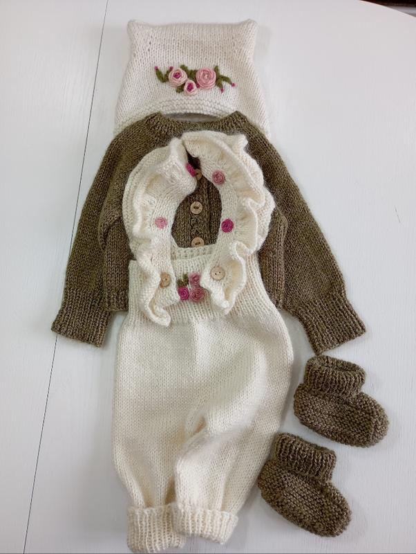 Неймовірно ніжний та стильний комплект для малюка. Ідеальний варіант для виписки з пологового, фотосесії або повсякденних прогулянок. У комплект входить: в’язана кофтинка на ґудзиках повзунки з м’якими манжетами чепчик із милими «вушками» пінетки 🌹Декорований ніжними в’язаними трояндочками. 🧶 М’яка, приємна до тіла пряжа — комфорт для чутливої шкіри немовляти. ✨Ручна робота з любов’ю та увагою до деталей. Стан: новий / ручна робота Розмір: для новонародженого (0–3 міс) Ідеальний варіант на подарунок 💝