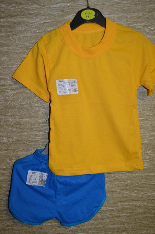 Річний комплект на ріст 86-92 * 56 розмір , виробництво Україна Футболка: ПОГ 26 см Довжина по спинці 40 см Шорти: гумка ( підлозі обхват) 16 см тягнеться до 30 см Довжина 24 см