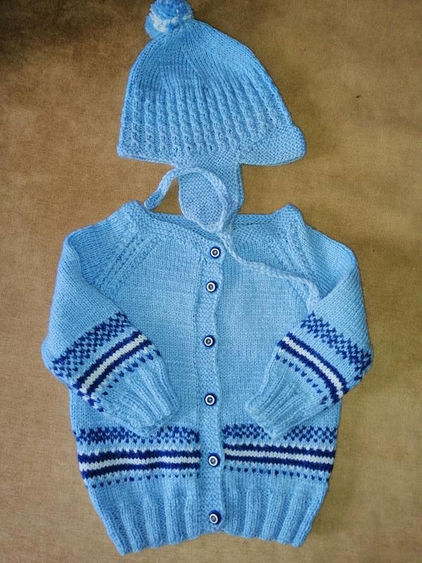 Блакитна кофтинка на хлопчика довжина 30 см,рукав від горловини 28 см полушир. 26,шапочка в нерозтягнутому вигляді 38см