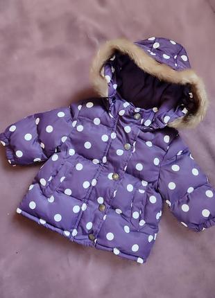 Дитяча куртка для дівчинки, фіолетового кольору в білий горошок. Сезон холодна весна-осінь, зима. Утеплена флісом та має наповнювач, рукав лише наповнювач. Має капюшон з мехом пристібнутий на замочок. Має кармани робочі. Застібається на замочок та кнопки високо під шийку. Дуже зручна та тепла. Швидко відросли тому стан ідеальний без дефектів. Розмір 0-3 місяці ми носили довше. Бренд Mamas&Papas