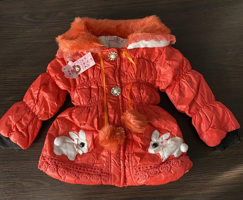 Куртка тепла осіння, верх-пластовка, наповнювач синтепон 150, підкладка мех-травка, є манжети з рибани, кишені. Дуже красивий дизайн, прикрашена хутром на комірі, нашивками милих кроликів, мереживом, є два хутряні помпони. Йде на холодну осінь, дуже тепла та м'яка. Розмірів два: 6-9 міс, 9-12 міс, за необхідності надам виміри.
