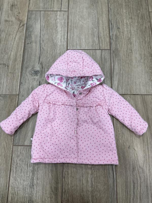 Очень милая двусторонняя курточка от бренда George, размер 3-6 м (62-68см), с одной стороны розовая в сердечко, с другой цветочный принт, состояние новой, очень приятная натуральная ткань