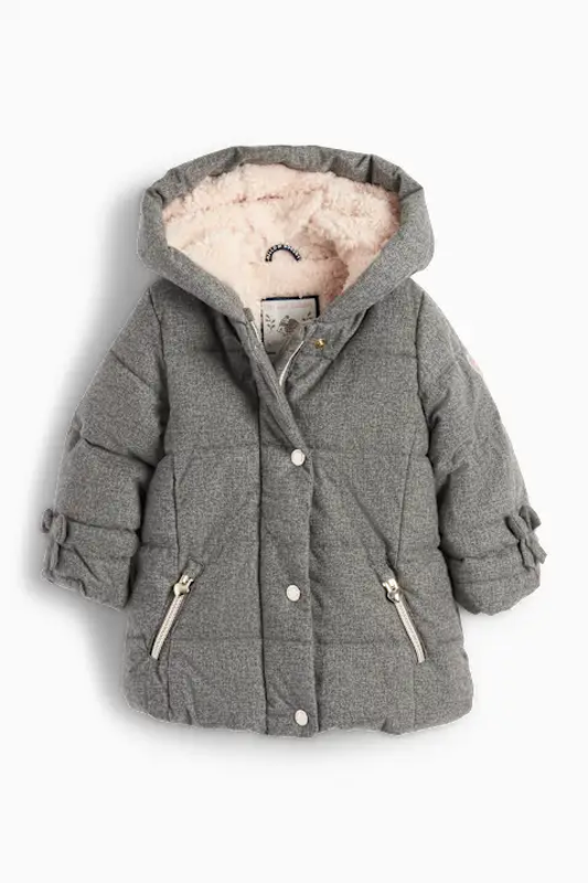 Дитяча стьобана зимова куртка з м'якої тканої тканини з капюшоном. Дві кишені на блискавці та краї рукавів з декоративним бантом. Затишна плюшева підкладка. Застібка блискавка із захистом та кнопки. Колір : темно-сірий. Склад: 100% поліестер, рукави: 100% поліестер. Зріст/розмір: 80 см (9-12М)