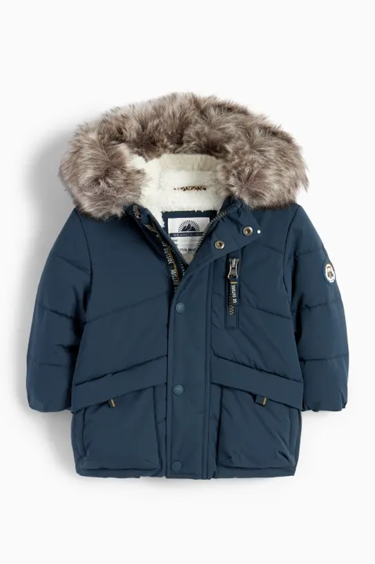Дитяча стьобана куртка з тканого матеріалу. Капюшон зі знімною обробкою зі штучного хутра, кишеня на блискавці на грудях та дві прорізні кишені. Гумова аплікація на рукаві та тепла підкладка з веддевого хутра. Колір : темно-синій Склад: Основна частина: 100% поліестер, Оздоблення: 41% акрил/38% поліестер/21% модакрил Зріст/розмір: 68 (3-6М).