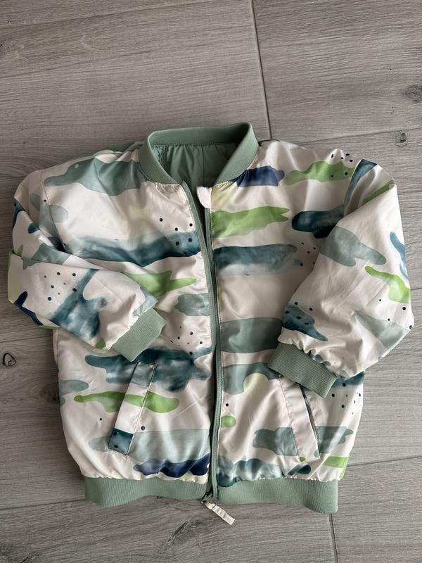 Двостороння дитяча курточка: з однієї сторони кольорова, з іншої - зелена. З обох сторін є кишеньки. Куртка універсальна, може бути як для хлопчика, так і для дівчинки. Розмір 24-36