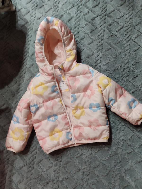 Дитяча дута куртка (вітровка) з капюшоном. Колір: Куртка переважно світло-рожевого кольору. Візерунок: Прикрашена квітковим візерунком у пастельних тонах, зокрема жовтого, блакитного та рожевого кольорів. Деталі: Має блискавку спереду, яка частково розстебнута, і виглядає теплою та м'якою. Розмір: На етикетці всередині видно розмір 86.