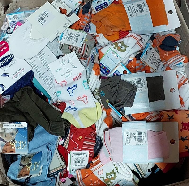 Дитячі шкарпетки оптом. В коробці більше 200 пар. Також попадаються жіночі шкарпетки. Є дитячі колготи. Розміри більшість до 3 рочків Є теплі і весна-осінь. Продаж тільки коробкою