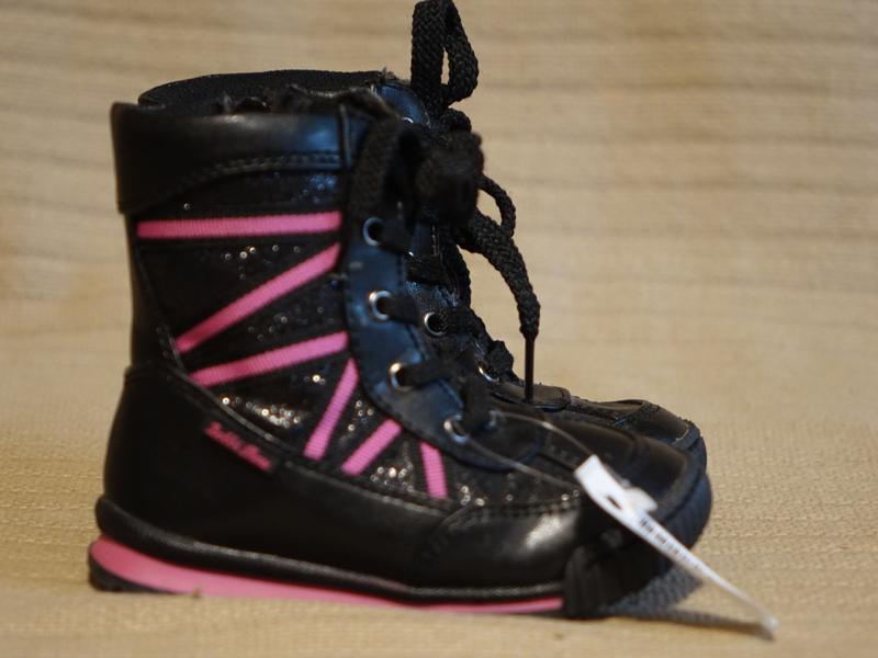 Продаются легенькие очень яркие сапожки немецкого мультибренда Deichmann, подбренд детской обуви Bobbi shoes. Модель выполнена в спортивном стиле. Обувь с достаточно широким мысом, нижняя часть которого защищена объемным резиновым кантом, обшитым по краю. Верх изделия выполнен из современных синтетических материалов : мягкая искусственная кожа черного цвета и плотная ткань черного цвета с блестящим напылением( фигурные вставки на боковых поверхностях сапожек). Наружные боковые поверхности обуви декорированы узкой розово-черной тесьмой. Спереди у сапожек традиционная шнуровка: через 5 пар люверсов продеваются мягкие плоские шнурки черного цвета. А на внутренней боковой поверхности предусмотрена фирменная молния черного цвета - ykk. Все детали изделия аккуратно отстрочены ровным двойным швом прочными нитками черного цвета. Изнаночная сторона сапожек оснащена мягкой дышащей флисовой подкладкой черного цвета. Стелька мягкая флисовая не съемная. Межподошва - легкая амортизационная вспененная резина розового цвета. Основная подошва выполнена из высококачественной износостойкой рифленой резины черного цвета с гибкими амортизационными круглыми вставки резины розового цвета. Сапожки имеют состояние новой вещи без видимых следов носки. Размер 22. Длина стельки - 13,5 см.