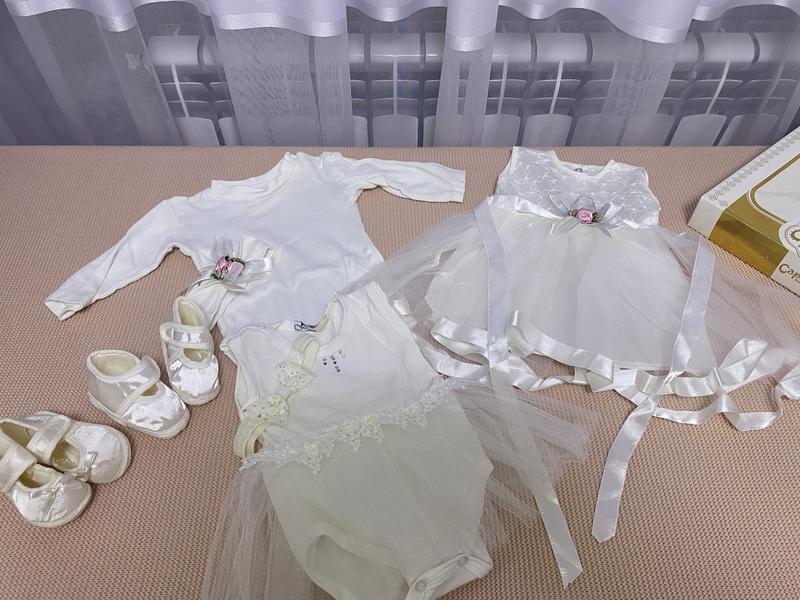 Чудовий набір, підійде для хрещення чи будь якої іншої події. Стан ідеальний, в набір входить основна сукня, боді з довгим рукавчиком, дві пари туфельок, повʼязка на голову, та в подарунок боді+повʼязка❤️