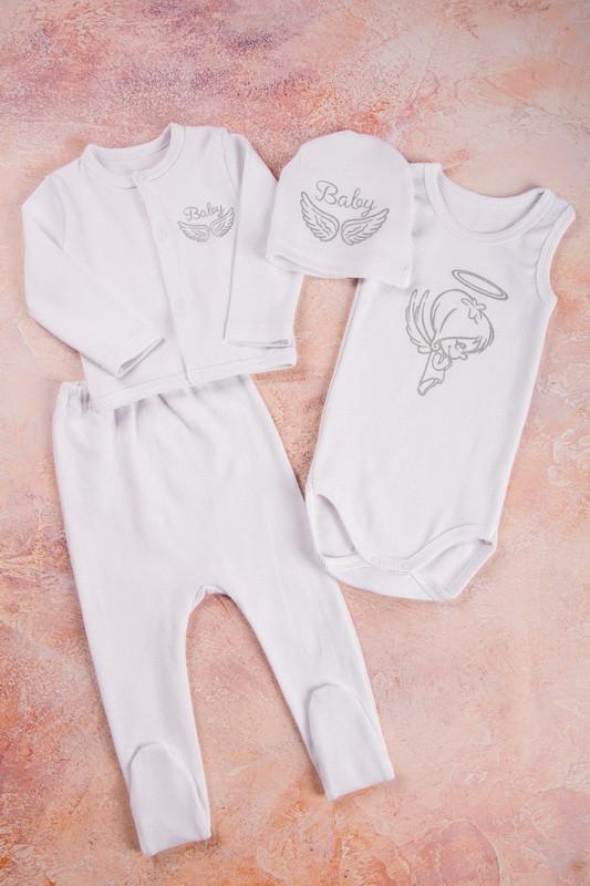Набор для крещения В комплект входит кофта, боди, штаны и шапочка. Размеры: 62 см, 68 см Материал: хлопковый трикотаж, в рубчик