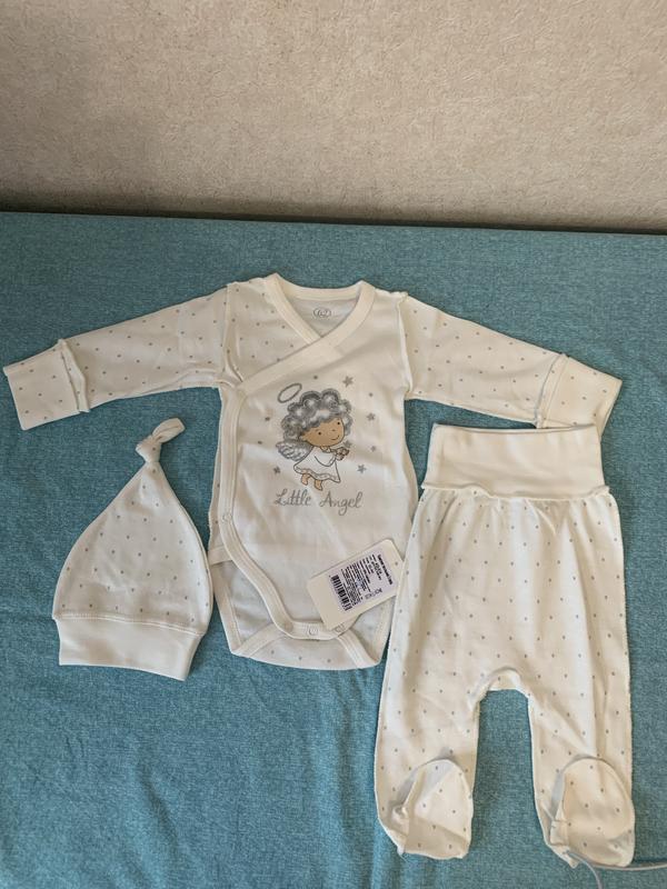Набір для хрещення. Купували для себе та дитинка вирішила зʼявитись раніше, тому хрестили раніше і розмір був завеликий. Набір виглядає дуже привабливо прикрашений набивним малюнком та блискітками на крапочках , молочного кольору.