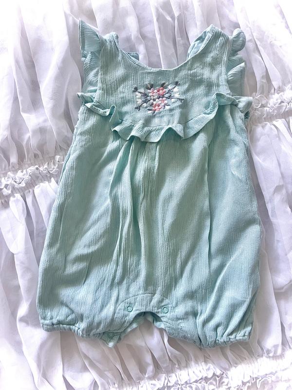 Мусліновий пісочник кольору тіфані на вік 3-6 місяців з вишитими квіточками знизу на кнопочках , ззаду на перламутрових кнопочках застібається. Дуже ніжний колір і приємний на дотик.