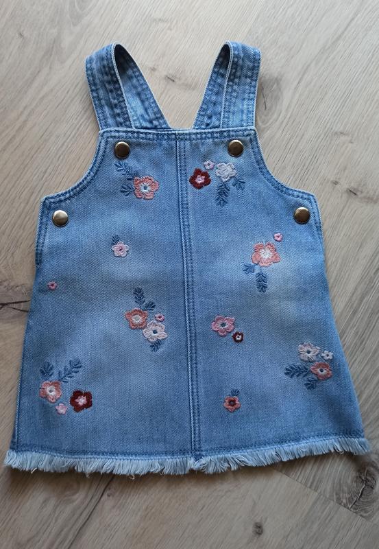 Дуже гарний джинсовий сарафан на дівчинку до трьох місяців, за худої статури можна і довше. З бахромою по низу,вишивкою квітами, застібки кнопки. Має підкладку по внутрішній стороні вишивки, що перешкоджає подразнення шкіри та натиранню