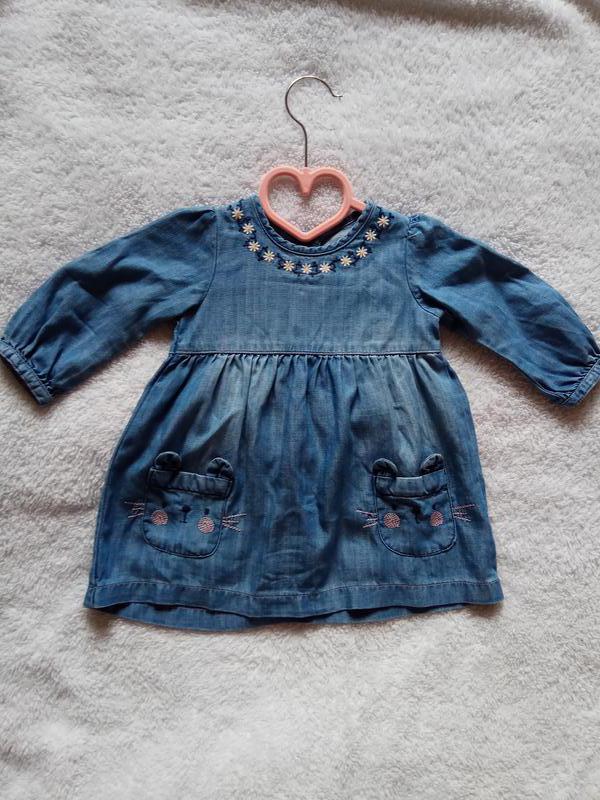 Джинсовое платье Matalan с кармашками-зайчиками. Тоненькое и легенькое. Сзади застегивается на пуговички, манжеты тоже на пуговицах. Одели раз. Размер по бирке 3-6. Реально и в год абсолютно не маленькое