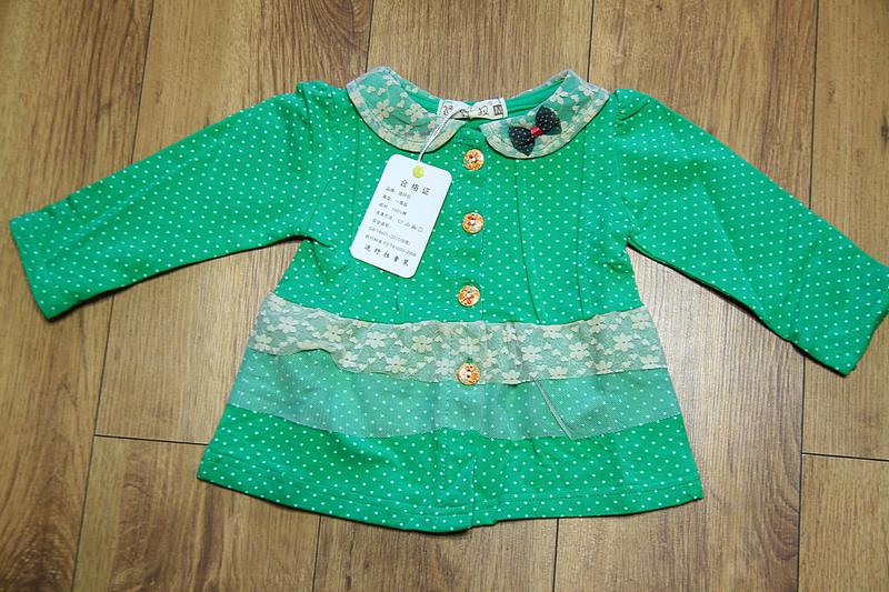 Трикотажное платьице зелёного цвета, в горошек. Длинный рукав. Платье украшено кружевом, пуговками с рисунком. На кружевном воротничке бантик. Есть два размера - M и L. От 6 месяцев до года и больше. На фото №2 ( среднее) цвет такой, как в реальности.