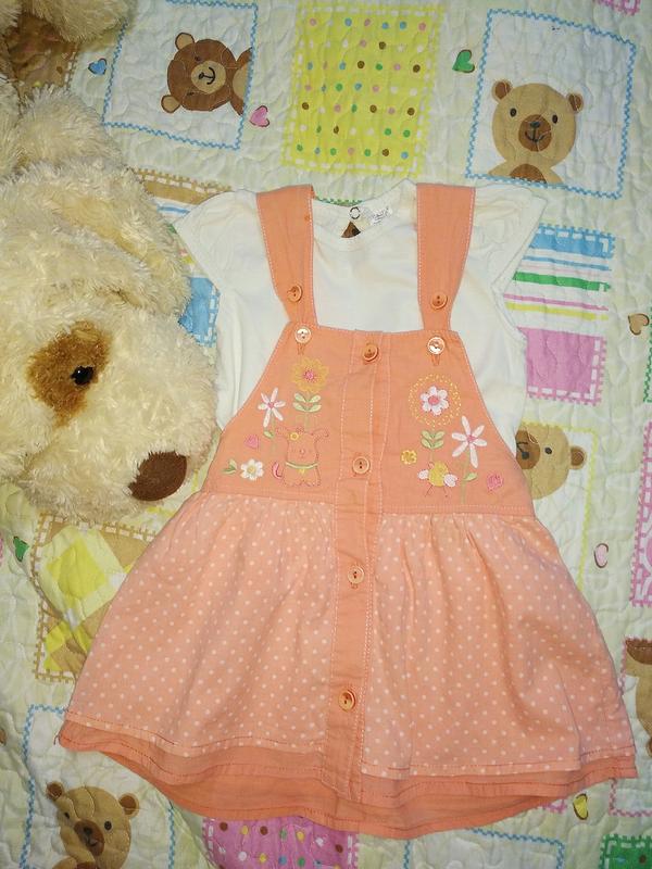 Чудовий легкий бавовняний сарафан в комплекті з білою футболкою, відмінної якості в ідеальному стані Є два положення гудзиків на брительках сарафана, що дає можливість носити довше Розмір на бірці носили в 1.5 року Довжина від верху лямки 45см