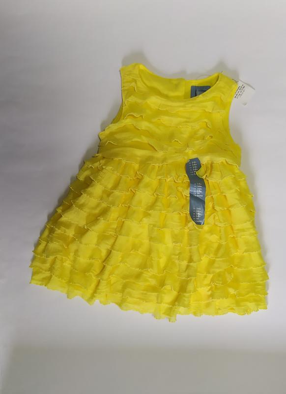 Жовта сукня з трусиками на підгузок бренду Gap. Тканина: - верх - 96% поліестр, 4% еластан. - підкладка 100% бавовна. Колір - жовтий. Розмір в наявності 3-6 місяці