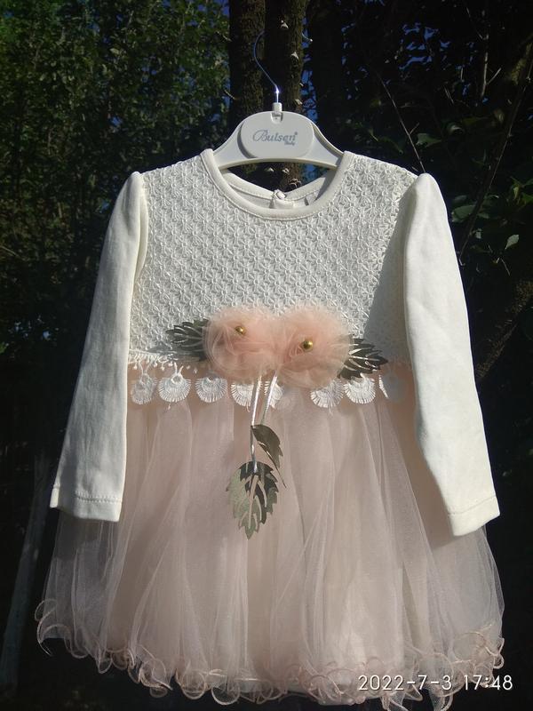 Святкове молочно -персикове плаття на дівчинку з пов'язаність язкою Розмір: 12 місяців - на зріст 80 см заміри: довжина 39,5(15/24,5 ) /41 см довжина рукава 28 см плечі 22,5 см пог 27 см пот 26,5 см пов'язаність язка 32×5,5 см Основна тканина: 100% бавовна Фатін - 100% поліестер Є підкладка Виробник Туреччина, Bulşen baby