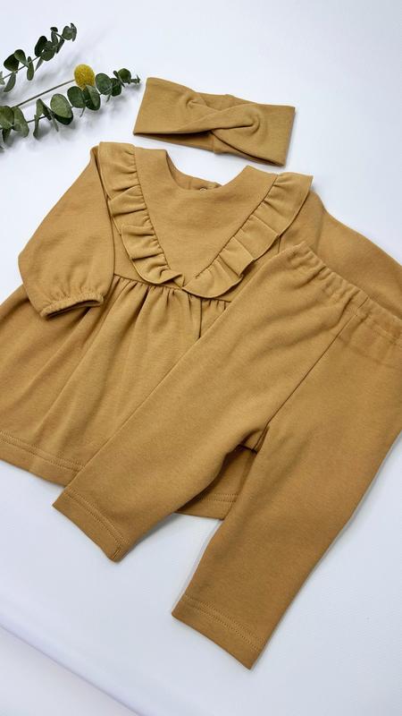 Красивий комплект для дівчаток в кольорі гірчиця. В наборі: сукня, штанці та повʼязка. Натуральний склад. Підійде на щодень, для святкових подій та фотосесій😍 Розміри: 74. Залюбки зроблю заміри та відправлю поштою.