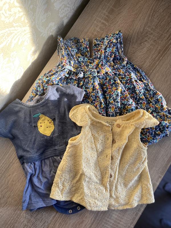 Красивый набор платьев для манюни. 0-3 мес. Желтая из прошвы может быть дольше, чем блузка. Синее с лимончиком платье-боди. В цветы пышная с подкладом. При необходимости дам замеры и фото на ребенке)