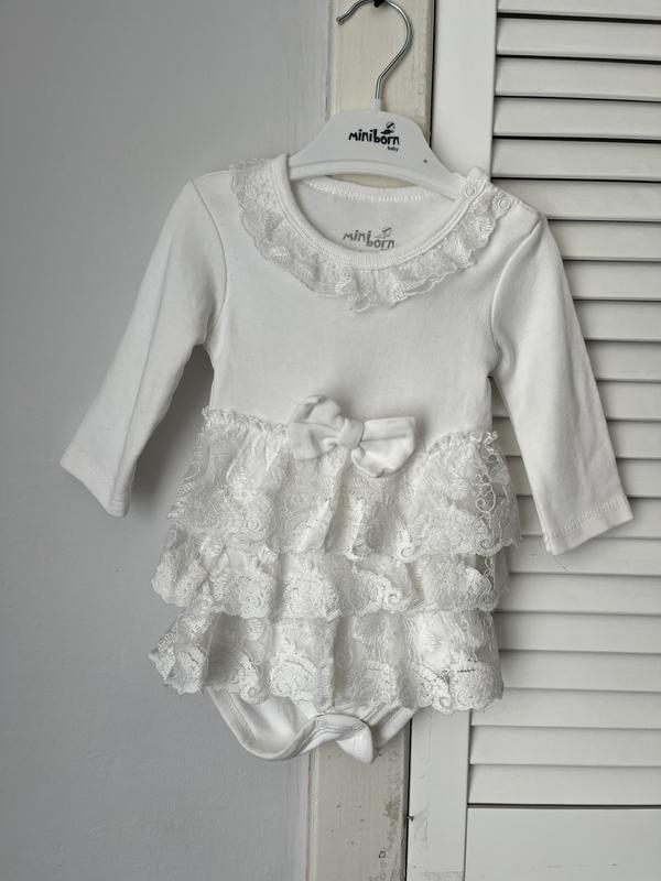 Сукня одягалась лише раз, в ідеальному стані. Розмір вказаний 3-6 міс, але трошки маломірить. Довжина від плечима до памперса 37 см, ширина(початок рюш) - 21 см. Повʼязка в комплекті.