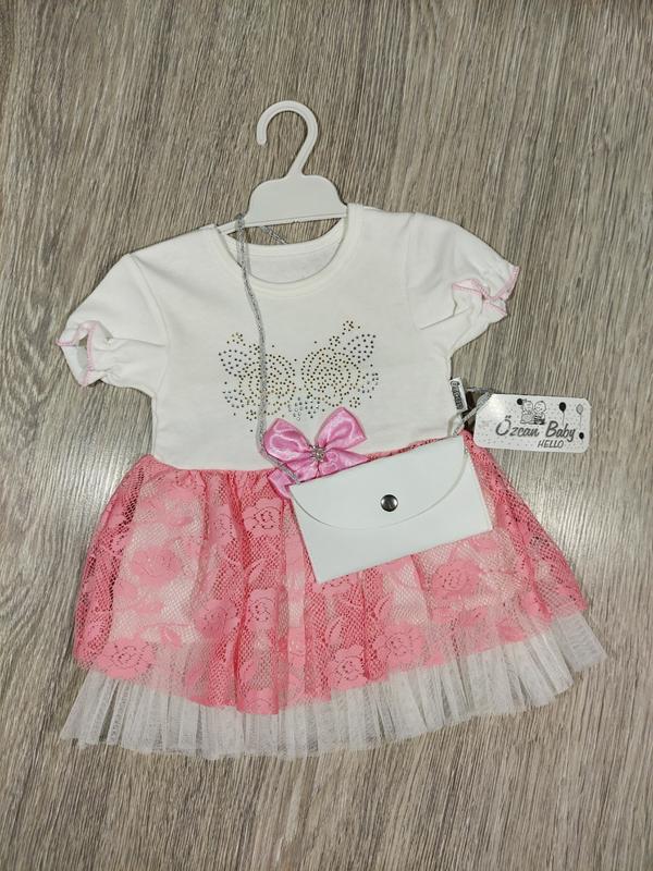 Літня сукня для дівчинки. У комплекті йде сумочка. Полотно бавовна, спідниця бавовна та фатін. На плечах дуже ніжна резинка. Розміри 74 см. Виміри: зріст 74 см-ширина плечей 20 см, Пог 22 см, довжина виробу 38 см. Виробник Туреччина. Ціна 180 грн.