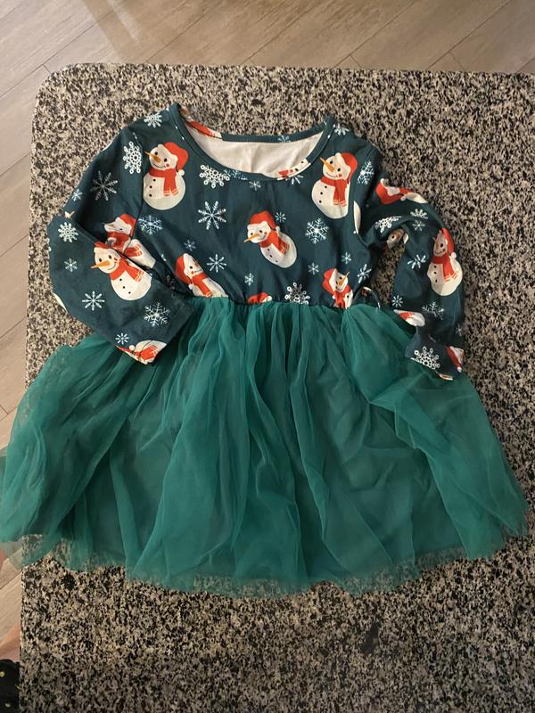 Новорічна сукня святкова для дівчинки зелена зі сніговиками та сніжинками. З фатиновою спідницею.