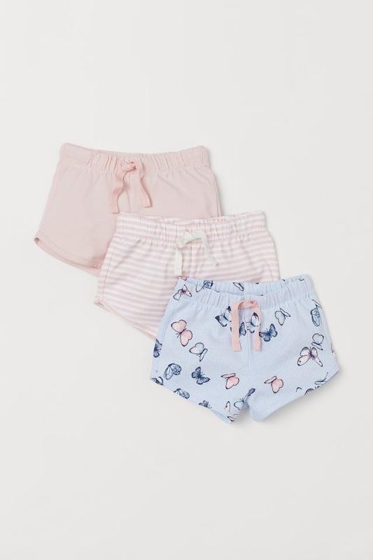 Комплект из 3-х пар трикотажных шортиков H&M Отличное качество по отличной цене! Шорты из мягкого хлопкового трикотажа с резинкой и кулиской на талии. Скругленный низ. Состав: Хлопок 100%. Цвет: розовый/бело-розовый/голубой с бабочками. Размеры в наличии: 86. Цена окончательная!
